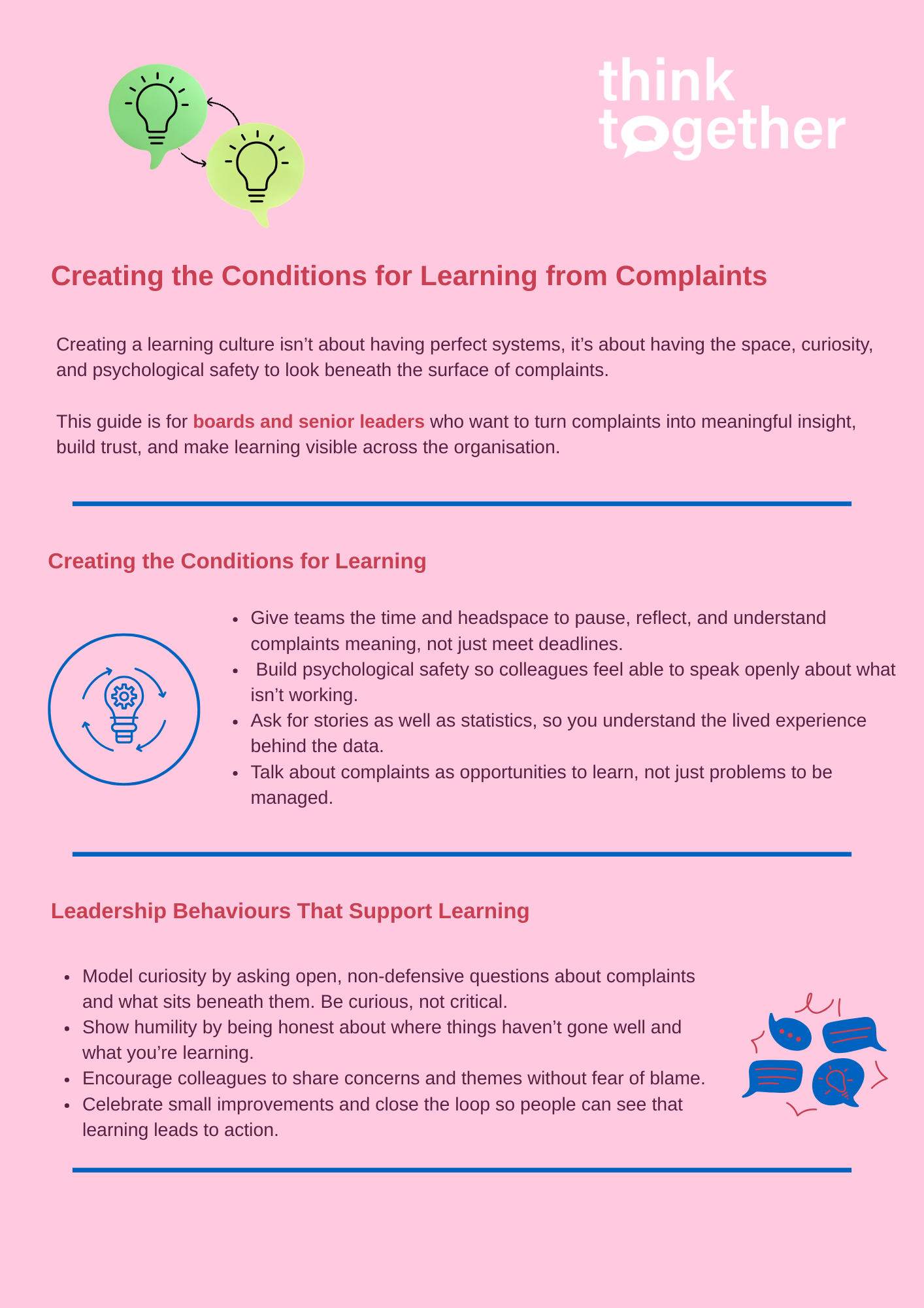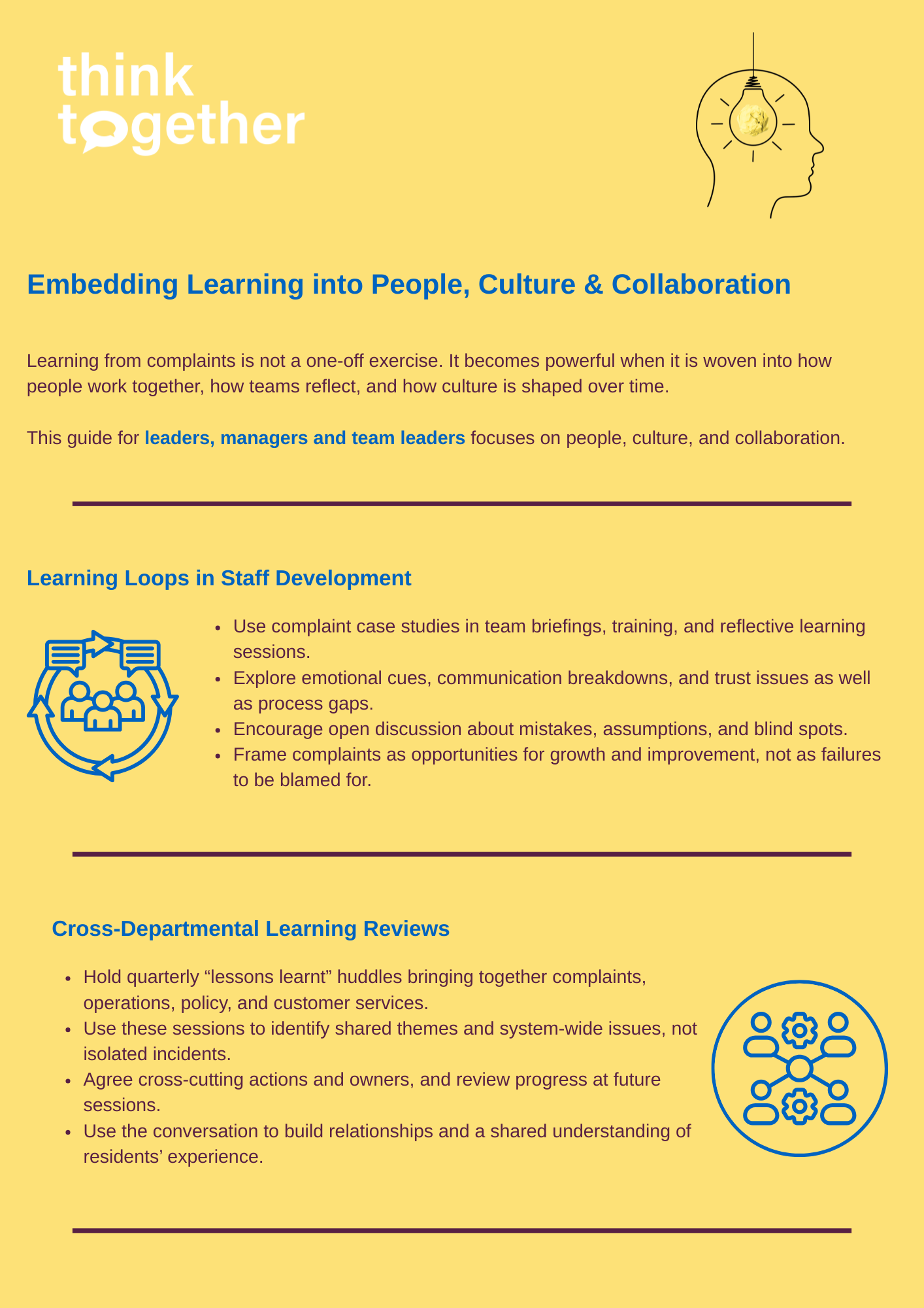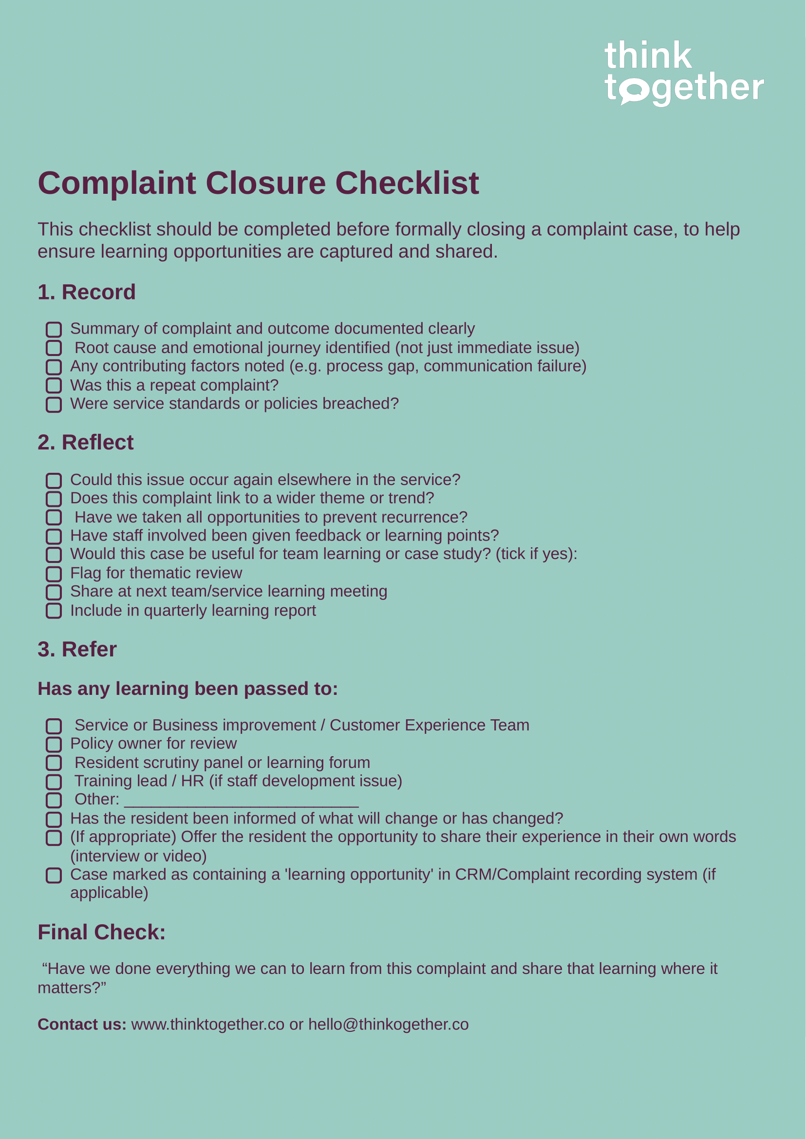 At think together, we help organisations strengthen their approach to complaints, from understanding root causes to supporting teams to make changes that improve customer experience and reduce repeat issues. That wider work is at the heart of what we do.